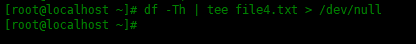 [root@localhost ~]# df -Th | tee file4.txt > /dev/null