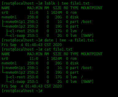 [root@localhost ~]# lsblk | tee file1.txt