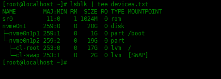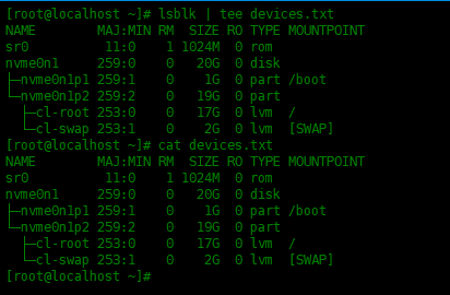 [root@localhost ~]# lsblk | tee devices.txt