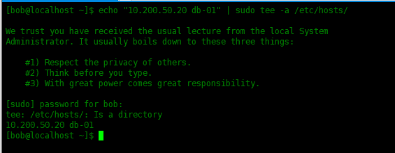 [bob@localhost ~]$ echo "10.200.50.20 db-01" | sudo tee -a /etc/hosts/