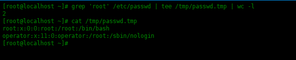 [root@localhost ~]# grep 'root' /etc/passwd | tee /tmp/passwd.tmp | wc -l