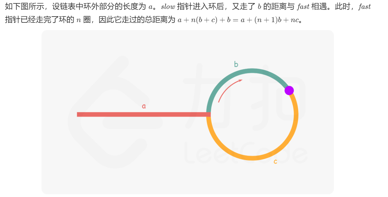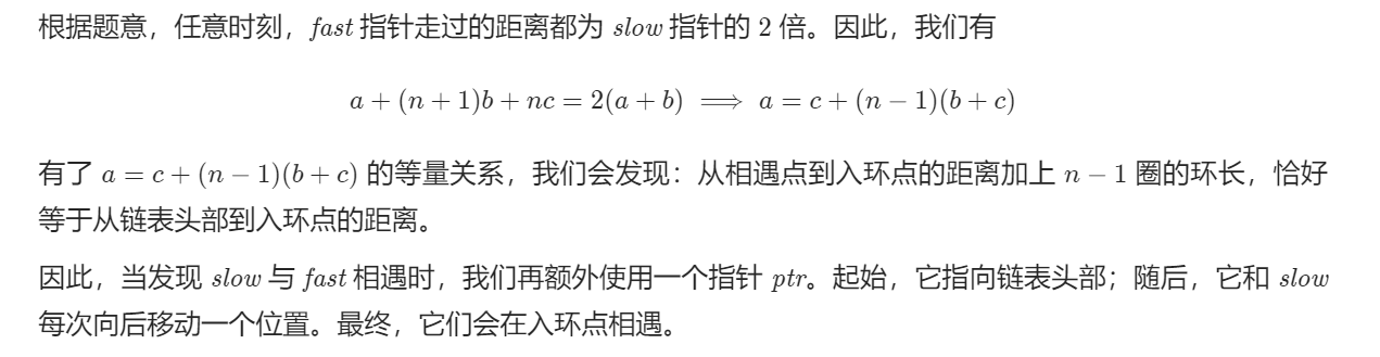 class Solution { public: ListNode *detectCycle(ListNode *head) { ListNode *slow = head, *fast = head; while (fast != nullptr) { slow = slow->next; if (fast->next == nullptr) { return nullptr; } fast = fast->next->next; if (fast == slow) { ListNode *ptr = head; while (ptr != slow) { ptr = ptr->next; slow = slow->next; } return ptr; } } return nullptr; } }; 作者:LeetCode-Solution 链接:https://leetcode-cn.com/problems/linked-list-cycle-ii/solution/huan-xing-lian-biao-ii-by-leetcode-solution/ 来源:力扣(LeetCode) 著作权归作者所有。商业转载请联系作者获得授权,非商业转载请注明出处。