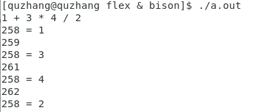%{ #include <stdio.h> %} %token NUMBER %token ADD SUB MUL DIV ABS %token EOL %% calclist : | calclist exp EOL { printf("= %d\n",$2); } ; exp : factor { $$ = $1;} | exp ADD factor { $$ = $1 + $3; } | exp SUB factor { $$ = $1 - $3; } ; factor : term { $$ = $1; } | factor MUL term { $$ = $1 * $3; } | factor DIV term { $$ = $1 / $3; } ; term : NUMBER { $$ = $1; } | ABS term { $$ = $2 >= 0? $2 : -$2; } ; %% main(int argc,char **argv){ yyparse(); } yyerror(char *s){ fprintf(stderr, "error:%s\n", s); }