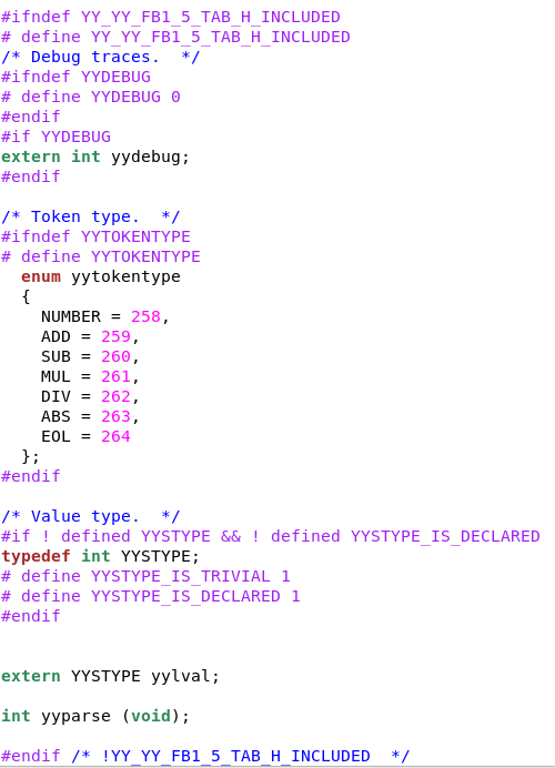 %token LP RP %% term : NUMBER { $$ = $1; } | ABS term { $$ = $2 >= 0? $2 : -$2; } | LP exp RP { $$ = $2; } ; %%