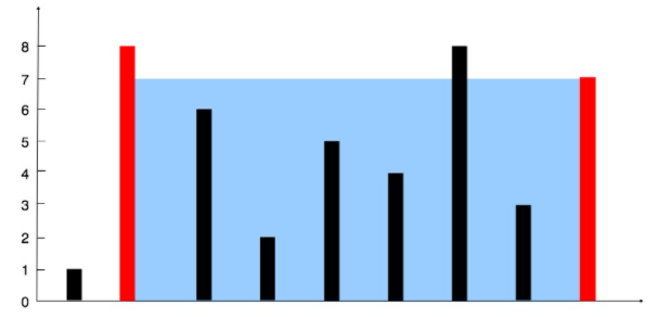 给你 n 个非负整数 a1,a2,...,an,每个数代表坐标中的一个点 (i, ai) 。在坐标内画 n 条垂直线,垂直线 i 的两个端点分别为 (i, ai) 和 (i, 0) 。找出其中的两条线,使得它们与 x 轴共同构成的容器可以容纳最多的水。