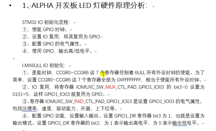 .gloval _start @global label _start: @ 使能所有外设时钟 ldr r0, =0x020c4068 @CCGR0 ldr r1, =0xffffffff @要写入的数据 str r1, [r0] @r1写道ccgr0 @@使能时钟 @ CCGR1 只要地址加4 ldr r0, =0x020c406c @要写入的数据 str r1, [r0] @r1写道ccgr0 ldr r0, =0x020c4070 @要写入的数据 str r1, [r0] @r1写道ccgr0 ldr r0, =0x020c4074 @要写入的数据 str r1, [r0] @r1写道ccgr0 ldr r0, =0x020c4078 @要写入的数据 str r1, [r0] @r1写道ccgr0 ldr r0, =0x020c407c @要写入的数据 str r1, [r0] @r1写道ccgr0 ldr r0, =0x020c4080 @要写入的数据 str r1, [r0] @r1写道ccgr0 @@iomux SW_MUX_CTL_GPIO1_IO3 SW MUX ==>set 5 @ address:20e_0000h+68 offset=20e_0068h ldr r0, =0x020e0068 ldr r1, =0x5 str r1, [r0] @@配置gpio1_io03的电气属性 ldr r0, =0x020e02f4 ldr r1, =0x10b0 str r1, [r0] @@设置GPIO /* *设置GPIO_GDIR1寄存器 0x0209c004 *设置GPIO1_GPIO3为输出 *就是GPIO1_IO03为输出 */ @选择gpio ldr r0, =0x0209c004 ldr r1, =0x8 str r1, [r0] @设置io输入输出 GPIOX_DR ldr r0, =0x0209c000 ldr r1, =0x0 str r1, [r0] /*cpu 不能处于未知状态 */ loop: b loop