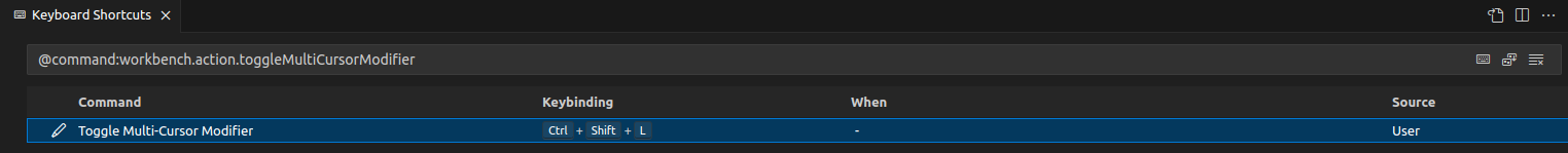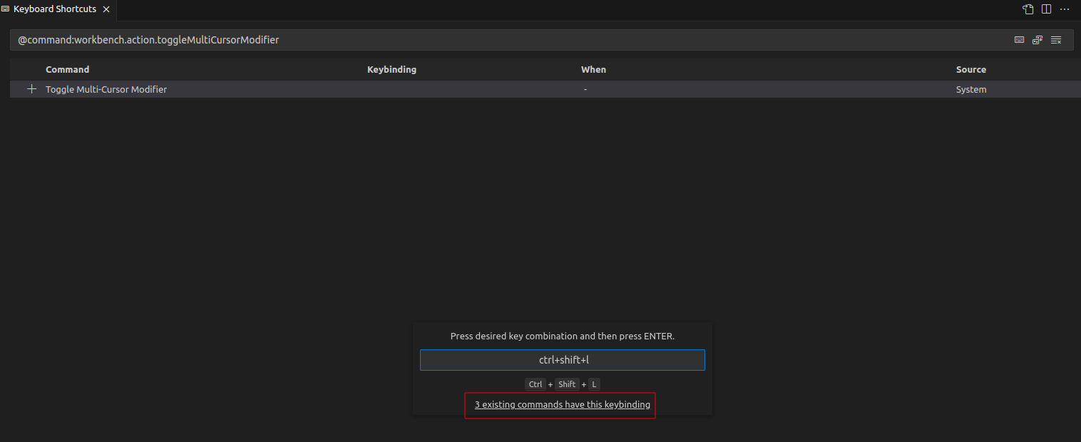 Deleting the existing "Ctrl+Shift+L" keyboard shortcuts and adding it for the command "Toggle Multi-Cursor Modifier" can not fix the problem.