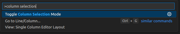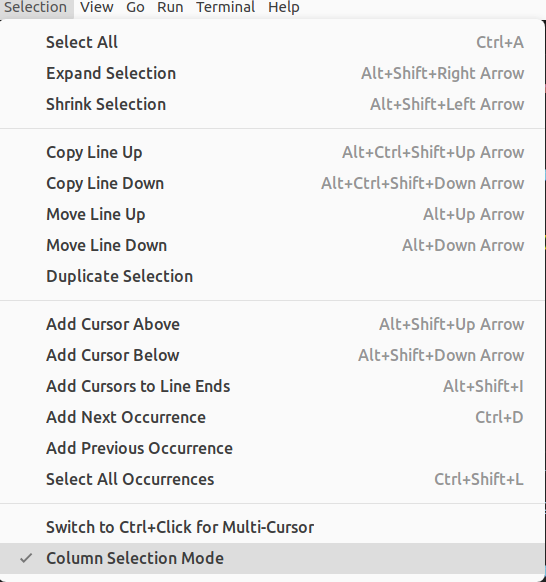 2. Enter Column Selection Mode from the Selection menu, and quit this mode also from the menu after editing: