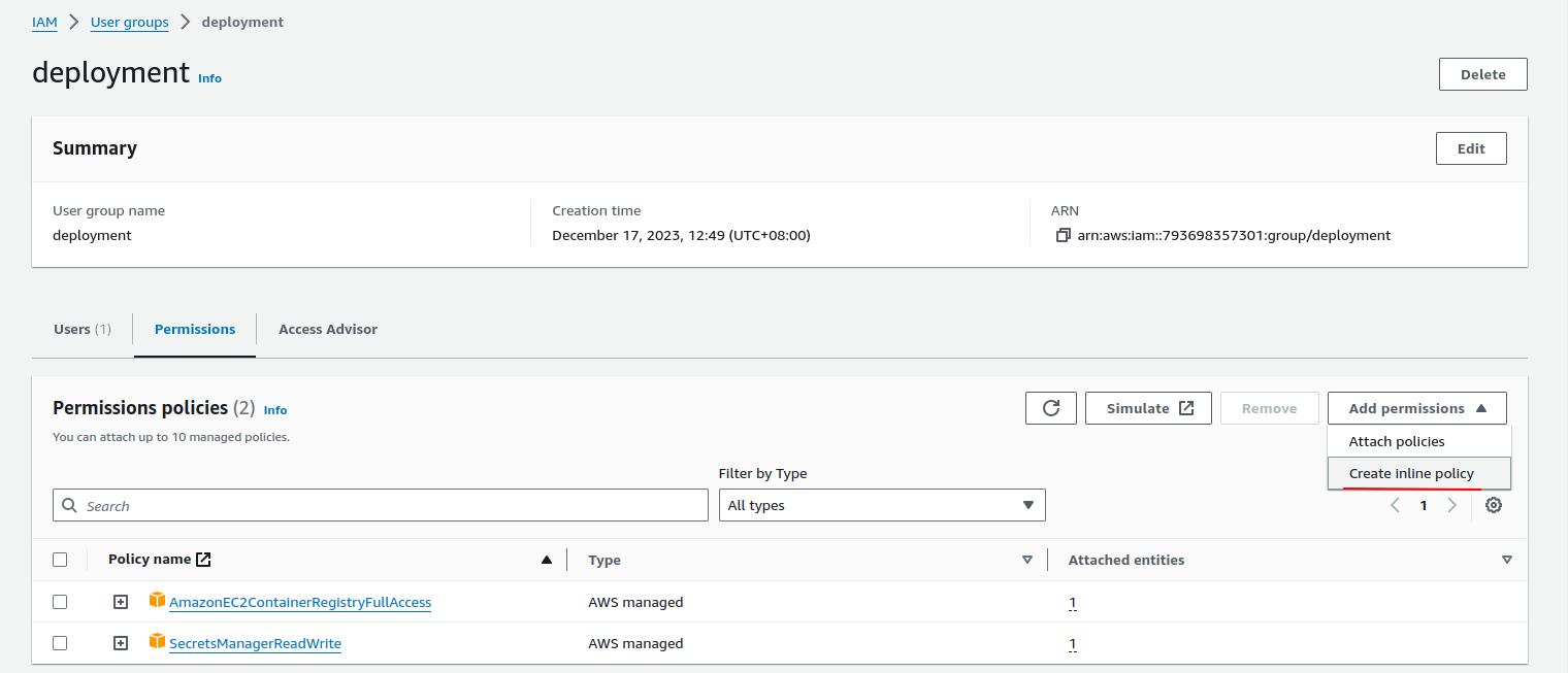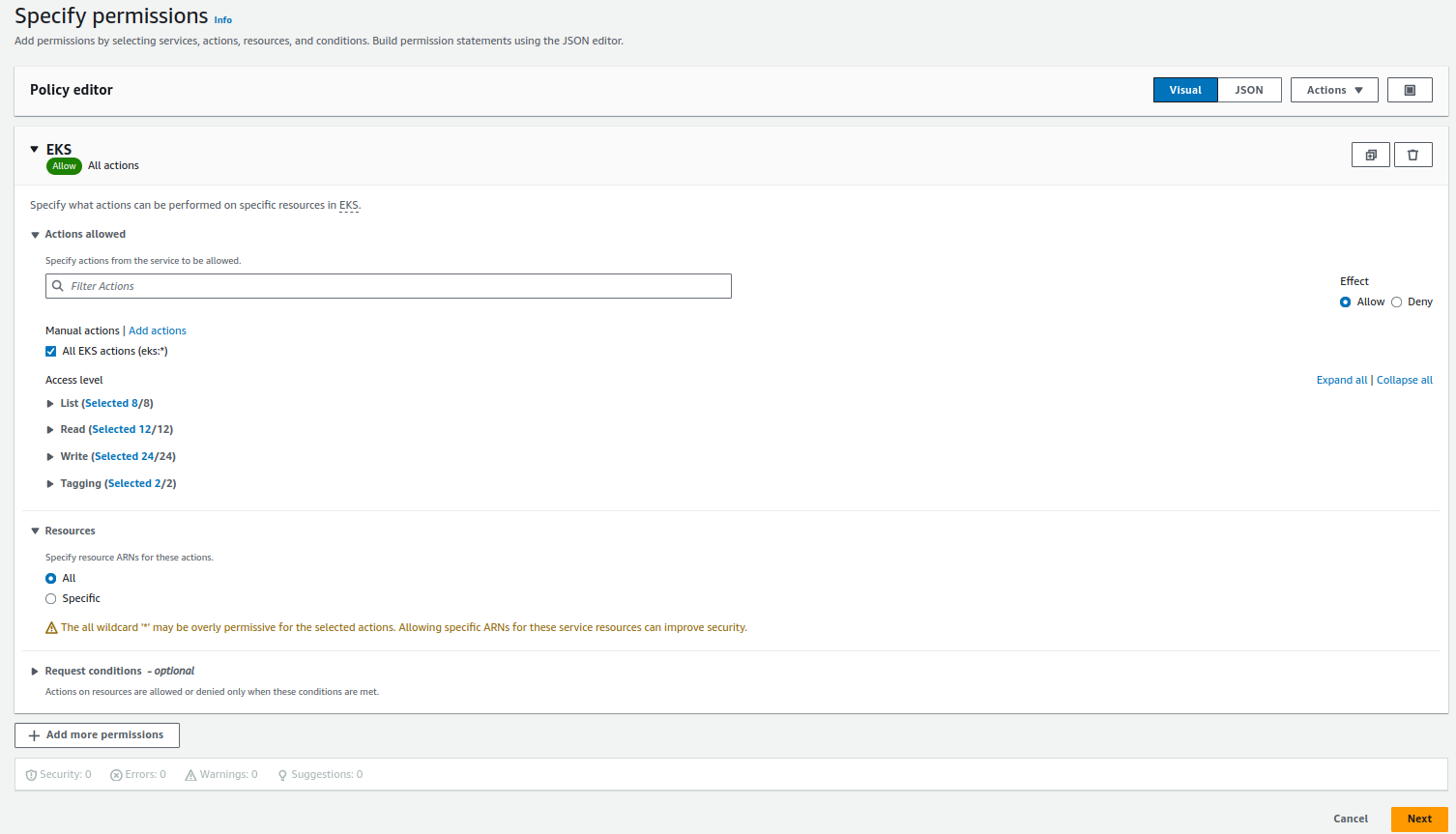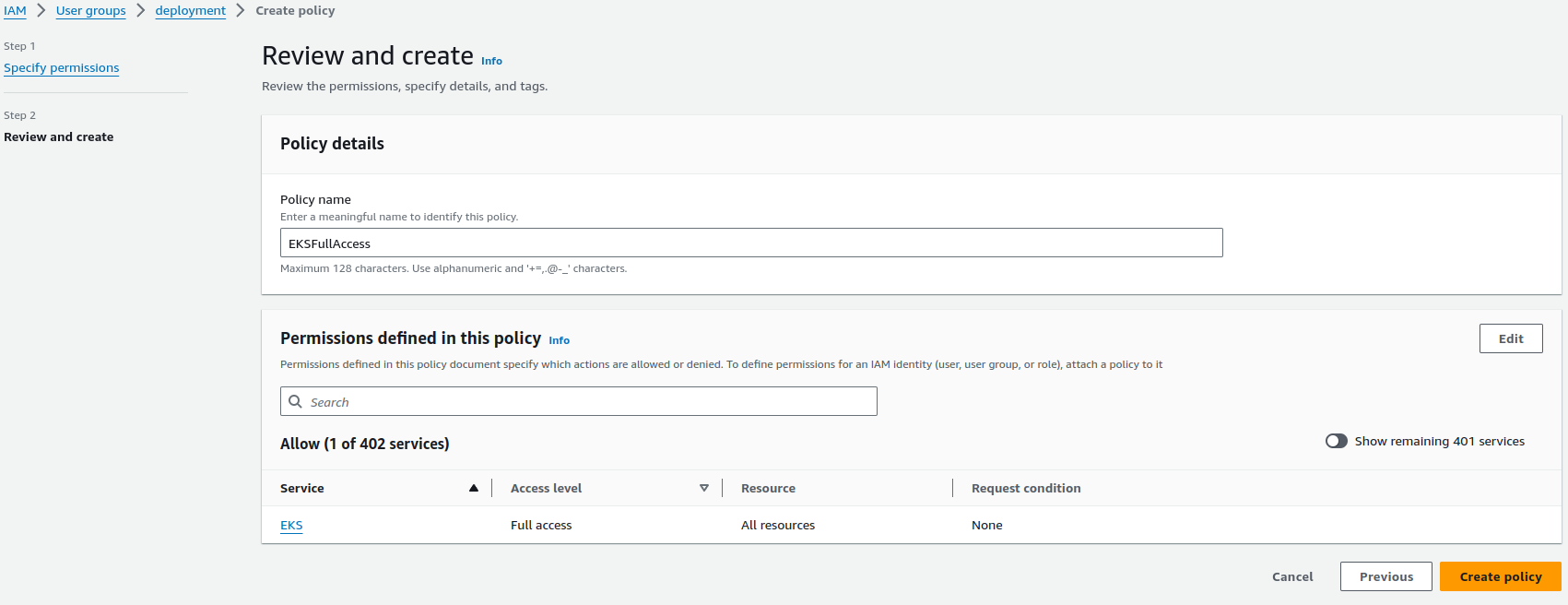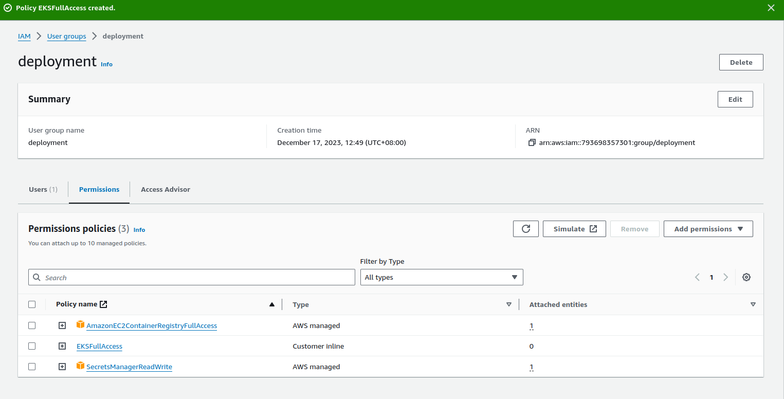 To fix this issue, we need to grant necessary EKS permissions to the user group which contains user github-ci: