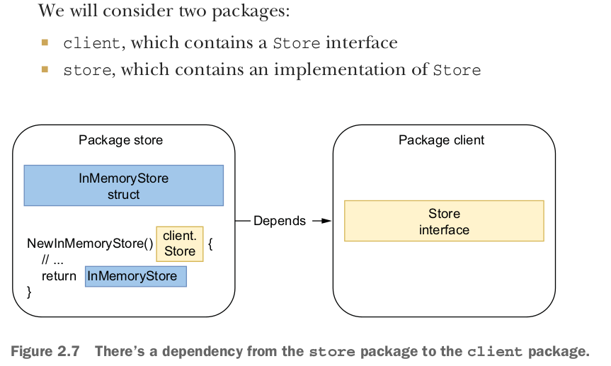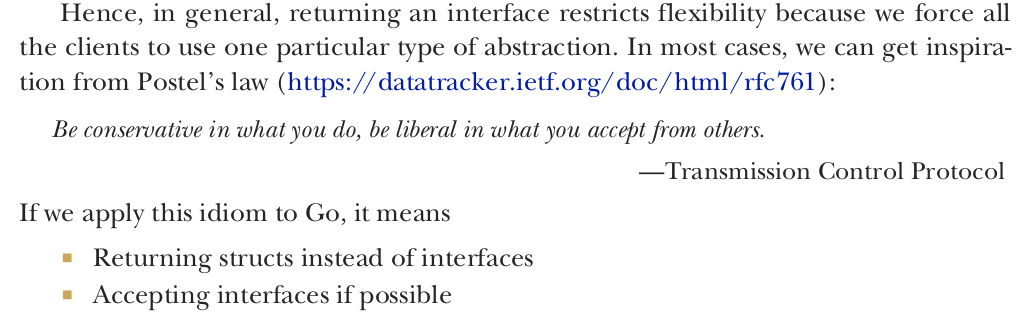 All in all, in most cases, we shouldn’t return interfaces but concrete implementations. Otherwise, it can make our design more complex due to package dependencies and can restrict flexibility because all the clients would have to rely on the same abstraction. Again, the conclusion is similar to the previous sections: if we know (not foresee) that an abstraction will be helpful for clients, we can consider returning an interface. Otherwise, we shouldn’t force abstractions; they should be discovered by clients. If a client needs to abstract an implementation for whatever reason, it can still do that on the client’s side.
