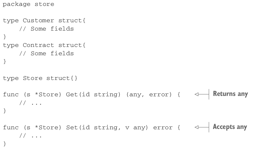 If future developers need to use the Store struct, they will probably have to dig into the documentation or read the code to understand how to use these methods. Hence, accepting or returning an any type doesn’t convey meaningful information. Also, because there is no safeguard at compile time, nothing prevents a caller from calling these methods with whatever data type.