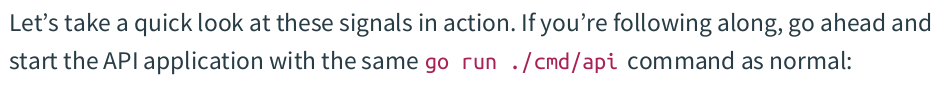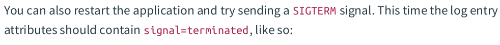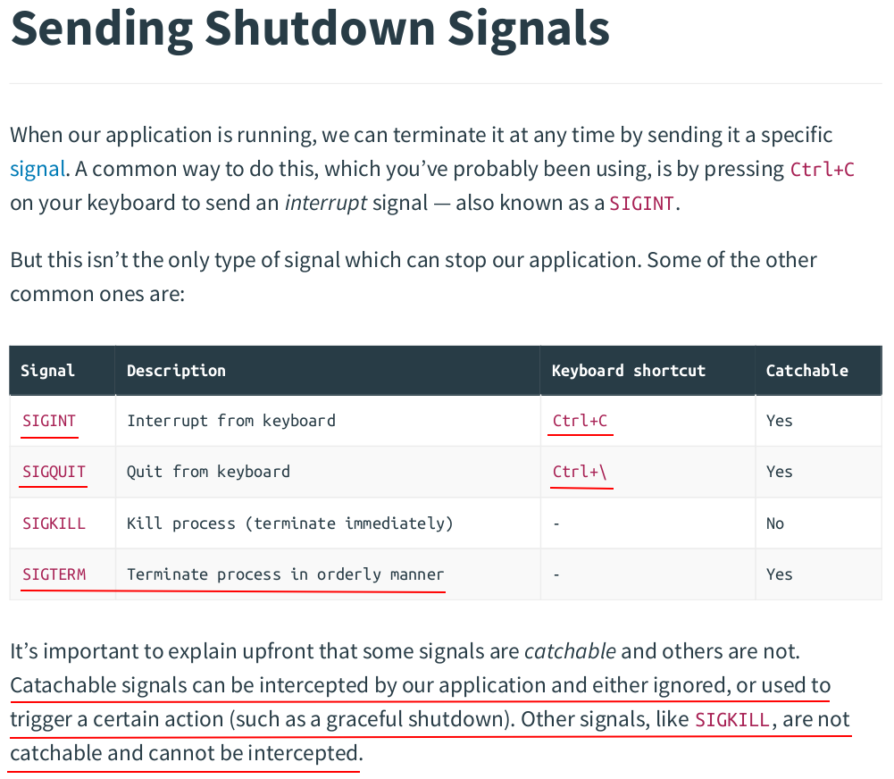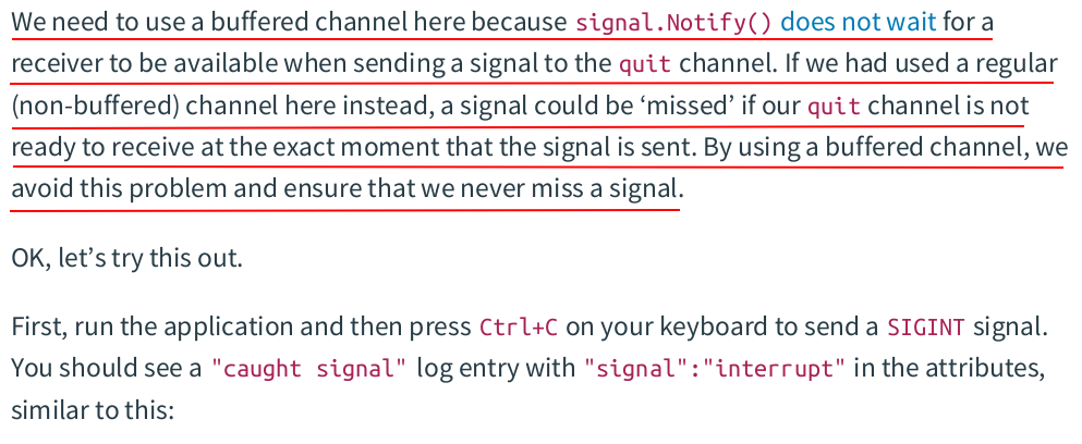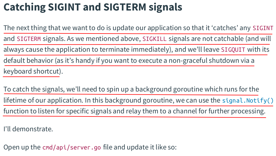 func (app *application) serve() error { srv := &http.Server{ Addr: fmt.Sprintf(":%d", app.config.port), Handler: app.routes(), IdleTimeout: time.Minute, ReadTimeout: 5 * time.Second, WriteTimeout: 10 * time.Second, ErrorLog: slog.NewLogLogger(app.logger.Handler(), slog.LevelError), } // Start a background goroutine to catch signals. go func() { quit := make(chan os.Signal, 1) // Use signal.Notify() to listen for incoming SIGINT and SIGTERM signals and // relay them to the quit channel. signal.Notify(quit, syscall.SIGINT, syscall.SIGTERM) // Read the signal from the quit channel. This code will block until a signal is received. s := <- quit app.logger.Info("caught signal", "signal", s.String()) os.Exit(0) }() app.logger.Info("starting server", "addr", srv.Addr, "env", app.config.env) return srv.ListenAndServe() }