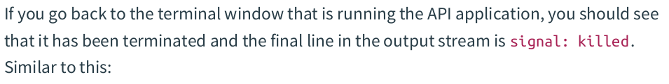Once that’s confirmed, go ahead and try sending a SIGKILL signal to the api process using the pkill command like so: