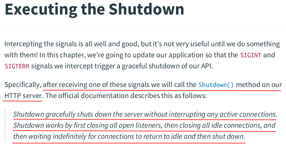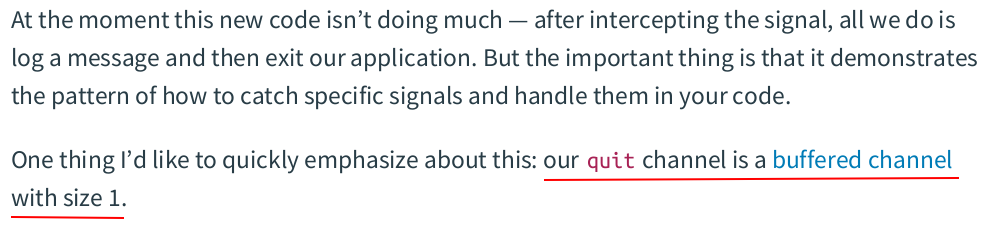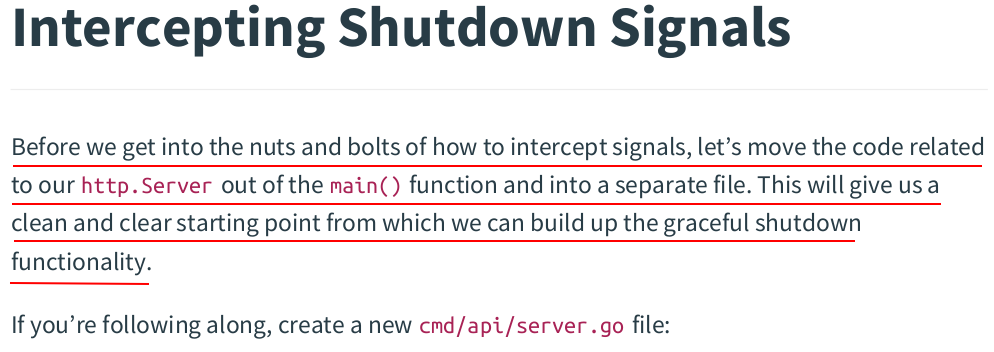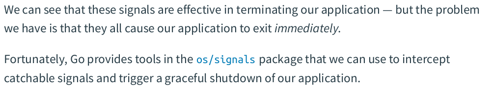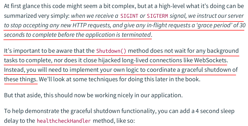 func (app *application) serve() error { srv := &http.Server{ Addr: fmt.Sprintf(":%d", app.config.port), Handler: app.routes(), IdleTimeout: time.Minute, ReadTimeout: 5 * time.Second, WriteTimeout: 10 * time.Second, ErrorLog: slog.NewLogLogger(app.logger.Handler(), slog.LevelError), } // The shutdownError channel is used to receive any errors returned by the // graceful Shutdown() function. shutdownError := make(chan error) // Start a background goroutine to catch signals. go func() { quit := make(chan os.Signal, 1) // Use signal.Notify() to listen for incoming SIGINT and SIGTERM signals and // relay them to the quit channel. signal.Notify(quit, syscall.SIGINT, syscall.SIGTERM) // Read the signal from the quit channel. This code will block until a signal is received. s := <- quit app.logger.Info("shutting down server", "signal", s.String()) ctx, cancel := context.WithTimeout(context.Background(), 30 * time.Second) defer cancel() shutdownError <- srv.Shutdown(ctx) }() app.logger.Info("starting server", "addr", srv.Addr, "env", app.config.env) err := srv.ListenAndServe() if !errors.Is(err, http.ErrServerClosed) { return err } err = <-shutdownError if err != nil { return err } app.logger.Info("stopped server", "addr", srv.Addr) return nil }