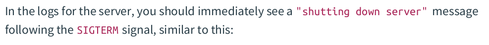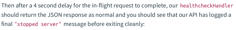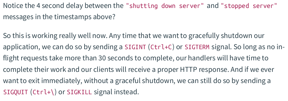 zzh@ZZHPC:/zdata/Github/greenlight$ go run ./cmd/api time=2024-11-18T21:27:01.271+08:00 level=INFO msg="database connection pool established" time=2024-11-18T21:27:01.271+08:00 level=INFO msg="starting server" addr=:4000 env=development time=2024-11-18T21:27:02.114+08:00 level=INFO msg="shutting down server" signal=terminated(此行在 curl & pkill 命令执行后立即出现,因为该日志是在srv.Shutdown(ctx)之前) time=2024-11-18T21:27:06.295+08:00 level=INFO msg="stopped server" addr=:4000 (此行在 curl & pkill 命令执行后4秒出现)
