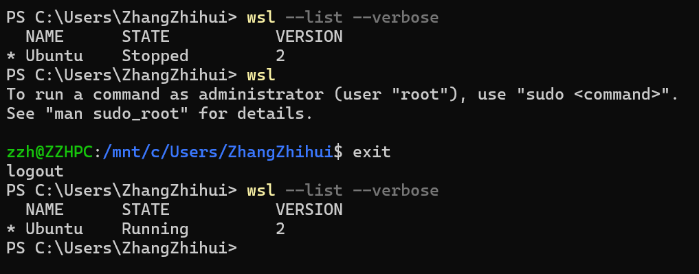 PS C:\Users\ZhangZhihui> wsl root@ZZHPC:/mnt/c/Users/ZhangZhihui# cat /etc/wsl.conf [boot] systemd=true root@ZZHPC:/mnt/c/Users/ZhangZhihui# vi /etc/wsl.conf root@ZZHPC:/mnt/c/Users/ZhangZhihui# cat /etc/wsl.conf [boot] systemd=true [user] default=zzh root@ZZHPC:/mnt/c/Users/ZhangZhihui# exit logout PS C:\Users\ZhangZhihui> wsl --shutdown Ubuntu PS C:\Users\ZhangZhihui> wsl To run a command as administrator (user "root"), use "sudo <command>". See "man sudo_root" for details. zzh@ZZHPC:/mnt/c/Users/ZhangZhihui$