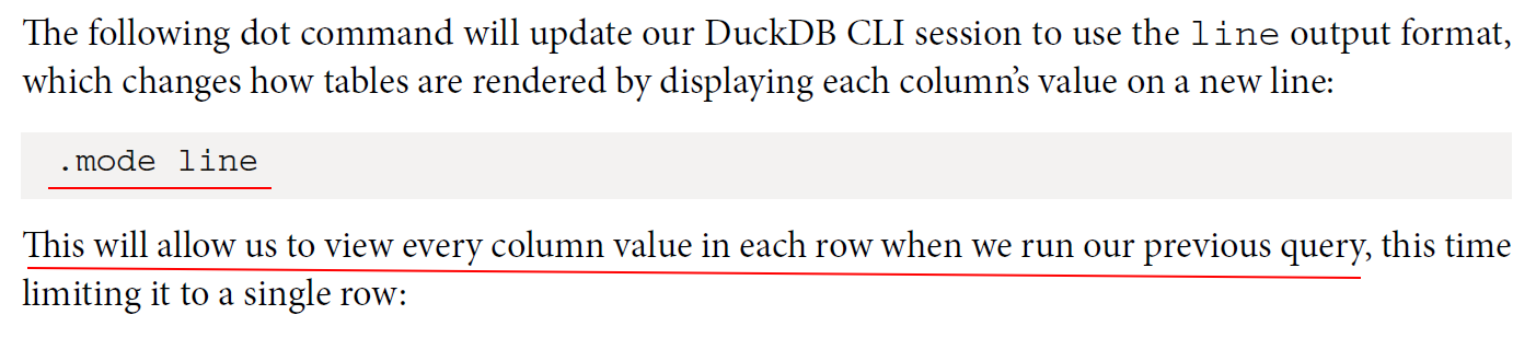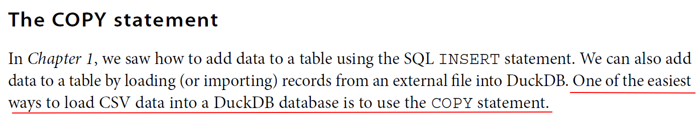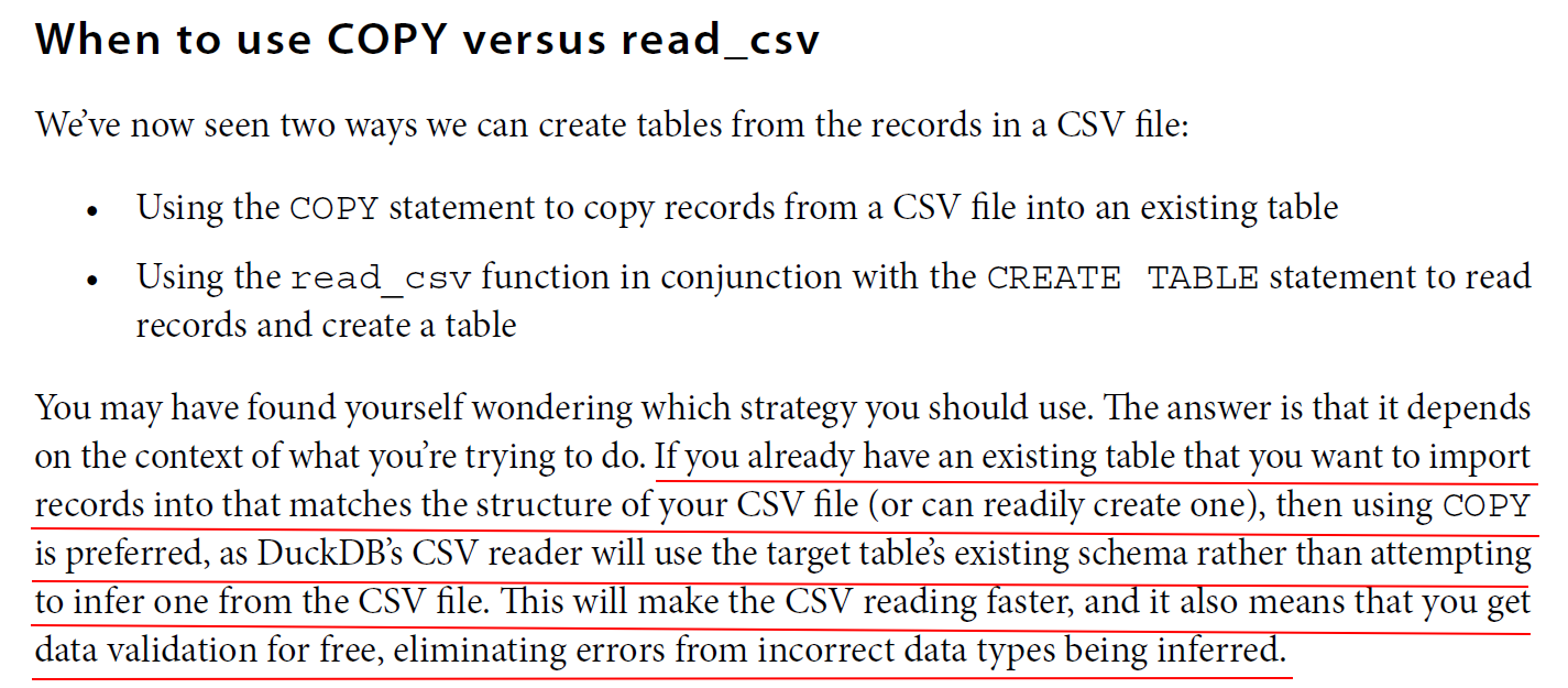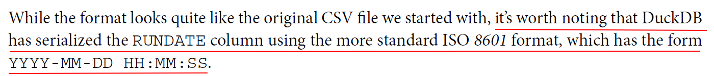 D .mode duckbox D CREATE OR REPLACE TABLE bikes AS SELECT * FROM read_csv( '74id-aqj9.csv', timestampformat='%Y%m%d%H%M%S', types={'RUNDATE': 'TIMESTAMP'}); 100% ▕████████████████████████████████████████████████████████████▏