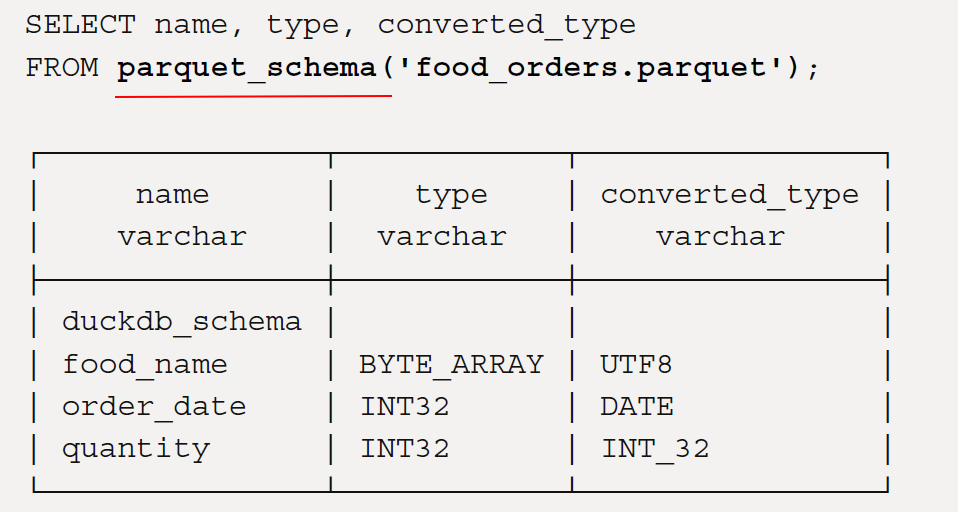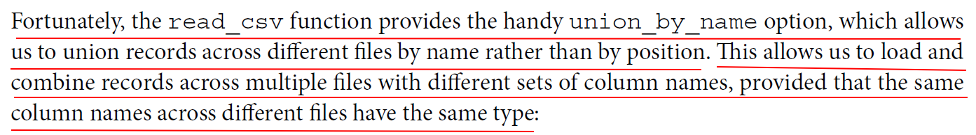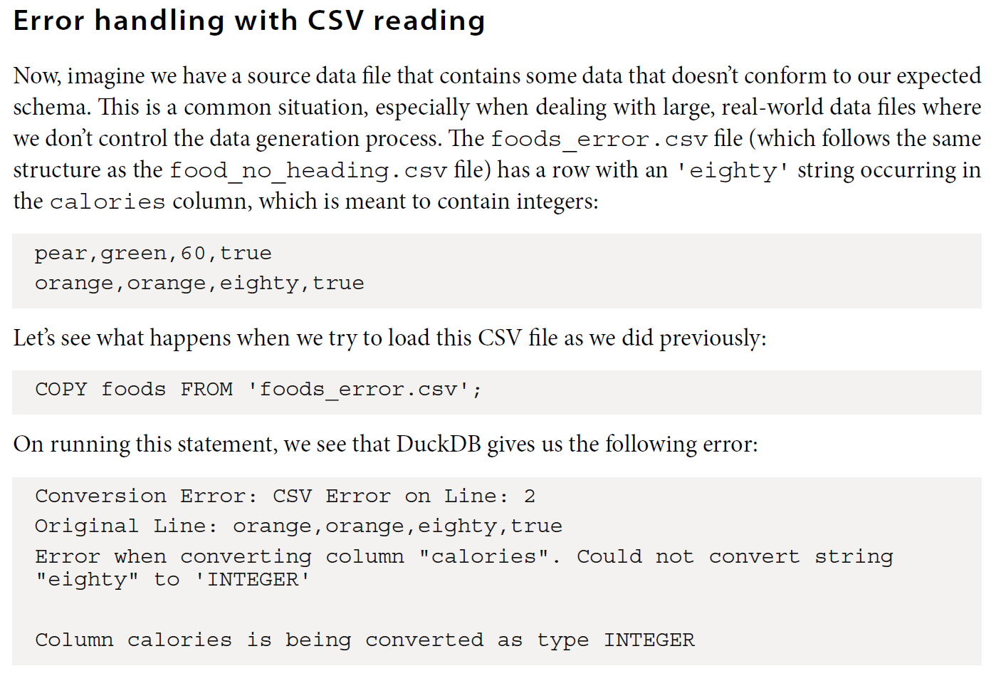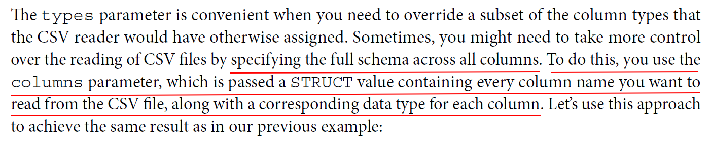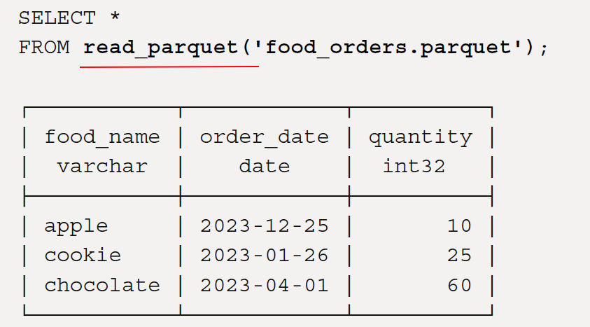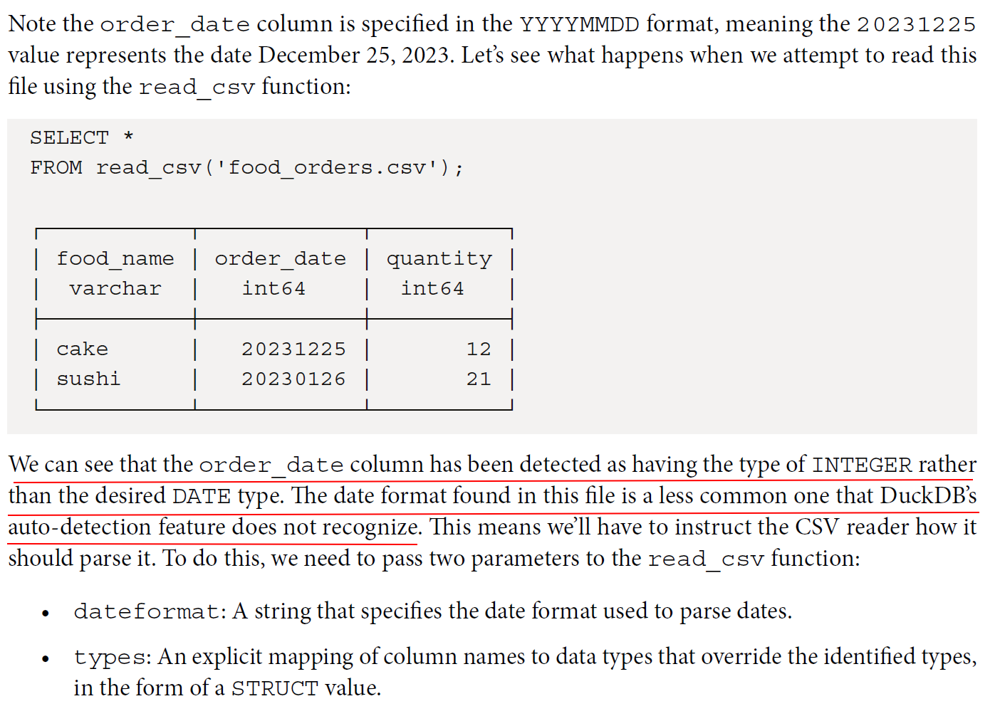 SELECT * FROM read_csv( 'food_orders.csv', dateformat='%Y%m%d', types={'order_date': 'DATE'} ); ┌───────────┬────────────┬──────────┐ │ food_name │ order_date │ quantity │ │ varchar │ date │ int64 │ ├───────────┼────────────┼──────────┤ │ cake │ 2023-12-25 │ 12 │ │ sushi │ 2023-01-26 │ 21 │ └───────────┴────────────┴──────────┘