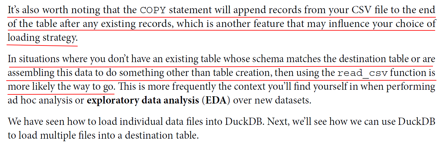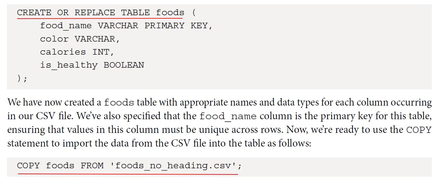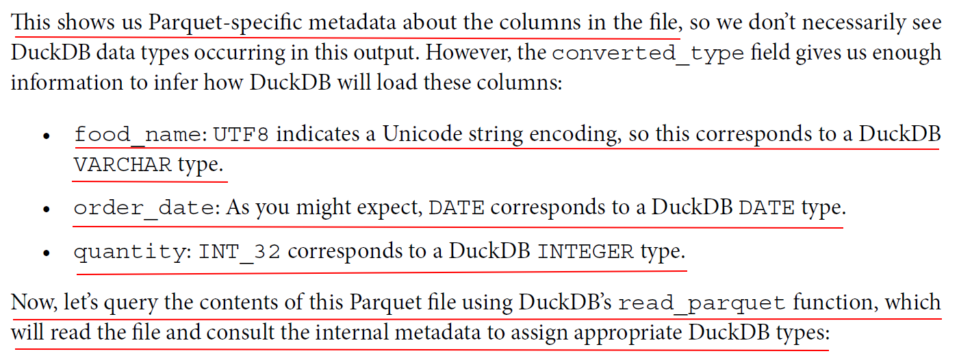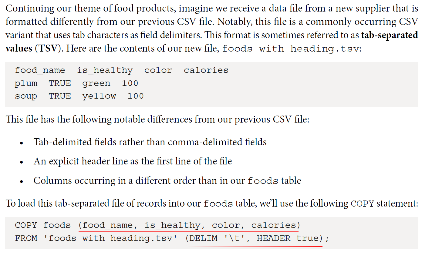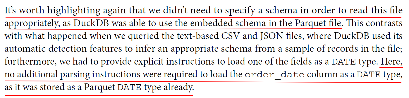 SELECT * FROM read_csv( 'food_orders.csv', dateformat='%Y%m%d', types={'order_date': 'DATE'} ); ┌───────────┬────────────┬──────────┐ │ food_name │ order_date │ quantity │ │ varchar │ date │ int64 │ ├───────────┼────────────┼──────────┤ │ cake │ 2023-12-25 │ 12 │ │ sushi │ 2023-01-26 │ 21 │ └───────────┴────────────┴──────────┘