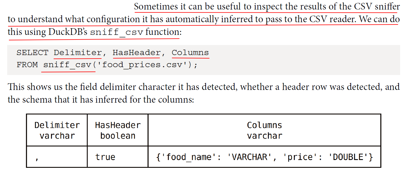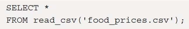 │ , │ " │ " │ \n │ │ 0 │ true │ [{'name': food_name, 'type': VARCHAR}, {'name': price, 'type': DOUBLE}] │ │ │ │ FROM read_csv('food_prices.csv', auto_detect=false, delim=',', quote='"', escap... │