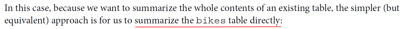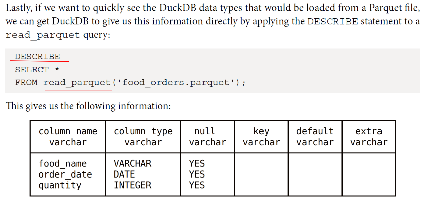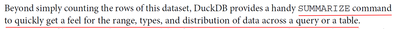 D DESCRIBE SUMMARIZE bikes; Parser Error: syntax error at or near "SUMMARIZE" LINE 2: SUMMARIZE bikes; ^ D DESCRIBE SELECT * FROM (SUMMARIZE bikes); ┌─────────────────┬──────────────┬─────────┬─────────┬─────────┬─────────┐ │ column_name │ column_type │ null │ key │ default │ extra │ │ varchar │ varchar │ varchar │ varchar │ varchar │ varchar │ ├─────────────────┼──────────────┼─────────┼─────────┼─────────┼─────────┤ │ column_name │ VARCHAR │ YES │ │ │ │ │ column_type │ VARCHAR │ YES │ │ │ │ │ min │ VARCHAR │ YES │ │ │ │ │ max │ VARCHAR │ YES │ │ │ │ │ approx_unique │ BIGINT │ YES │ │ │ │ │ avg │ VARCHAR │ YES │ │ │ │ │ std │ VARCHAR │ YES │ │ │ │ │ q25 │ VARCHAR │ YES │ │ │ │ │ q50 │ VARCHAR │ YES │ │ │ │ │ q75 │ VARCHAR │ YES │ │ │ │ │ count │ BIGINT │ YES │ │ │ │ │ null_percentage │ DECIMAL(9,2) │ YES │ │ │ │ ├─────────────────┴──────────────┴─────────┴─────────┴─────────┴─────────┤ │ 12 rows 6 columns │ └────────────────────────────────────────────────────────────────────────┘