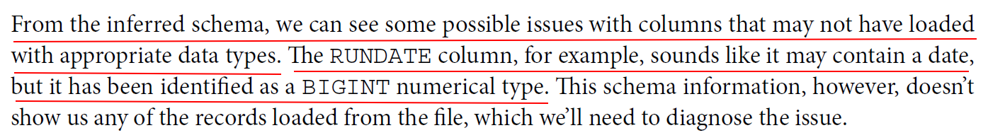 D DESCRIBE SELECT * FROM read_csv('74id-aqj9.csv'); ┌────────────────────┬─────────────┬─────────┬─────────┬─────────┬─────────┐ │ column_name │ column_type │ null │ key │ default │ extra │ │ varchar │ varchar │ varchar │ varchar │ varchar │ varchar │ ├────────────────────┼─────────────┼─────────┼─────────┼─────────┼─────────┤ │ ID │ BIGINT │ YES │ │ │ │ │ NAME │ VARCHAR │ YES │ │ │ │ │ TERMINALNAME │ BIGINT │ YES │ │ │ │ │ NBBIKES │ BIGINT │ YES │ │ │ │ │ NBEMPTYDOCKS │ BIGINT │ YES │ │ │ │ │ RUNDATE │ BIGINT │ YES │ │ │ │ │ INSTALLED │ BOOLEAN │ YES │ │ │ │ │ TEMPORARY │ BOOLEAN │ YES │ │ │ │ │ LOCKED │ BOOLEAN │ YES │ │ │ │ │ LASTCOMMWITHSERVER │ BIGINT │ YES │ │ │ │ │ LATESTUPDATETIME │ BIGINT │ YES │ │ │ │ │ REMOVALDATE │ VARCHAR │ YES │ │ │ │ │ INSTALLDATE │ BIGINT │ YES │ │ │ │ │ LAT │ DOUBLE │ YES │ │ │ │ │ LONG │ DOUBLE │ YES │ │ │ │ │ LOCATION │ VARCHAR │ YES │ │ │ │ ├────────────────────┴─────────────┴─────────┴─────────┴─────────┴─────────┤ │ 16 rows 6 columns │ └──────────────────────────────────────────────────────────────────────────┘