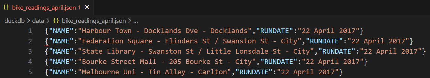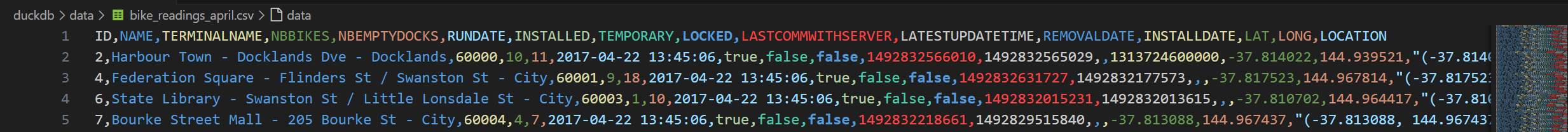 D .mode line D SELECT * FROM read_csv('74id-aqj9.csv') LIMIT 1; ID = 2 NAME = Harbour Town - Docklands Dve - Docklands TERMINALNAME = 60000 NBBIKES = 10 NBEMPTYDOCKS = 11 RUNDATE = 20170422134506 INSTALLED = true TEMPORARY = false LOCKED = false LASTCOMMWITHSERVER = 1492832566010 LATESTUPDATETIME = 1492832565029 REMOVALDATE = INSTALLDATE = 1313724600000 LAT = -37.814022 LONG = 144.939521 LOCATION = (-37.814022, 144.939521)