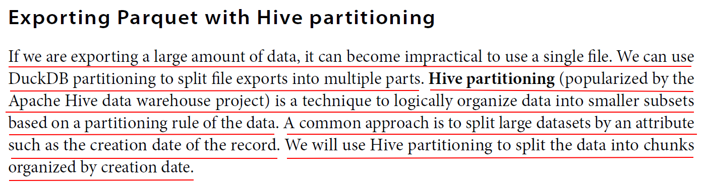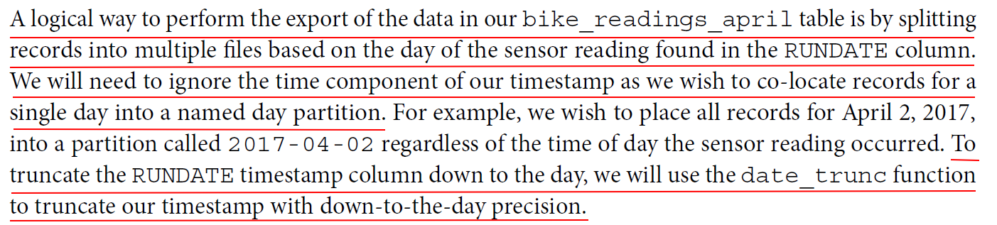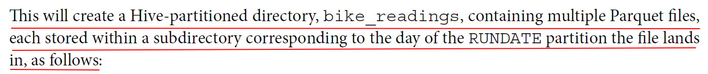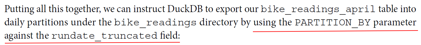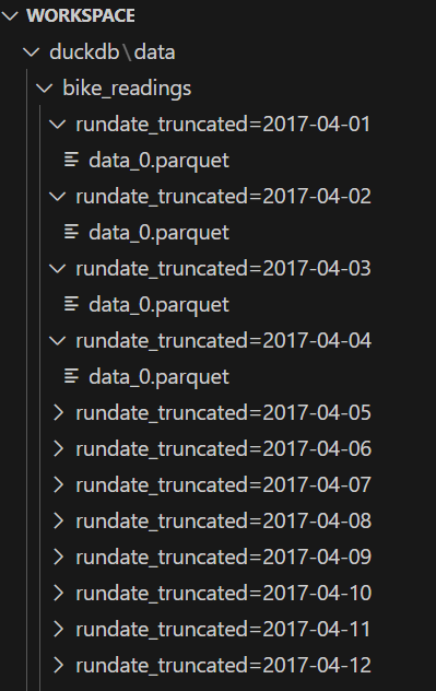 D COPY ( SELECT *, date_trunc('day', rundate) AS rundate_truncated FROM bike_readings_april ) TO 'bike_readings' ( FORMAT PARQUET, PARTITION_BY (rundate_truncated), OVERWRITE_OR_IGNORE true );