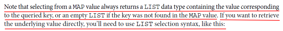 D SELECT movie_release_map['Quantum of Solace'] FROM movies; ┌────────────────────────────────────────┐ │ movie_release_map['Quantum of Solace'] │ │ int32[] │ ├────────────────────────────────────────┤ │ [2008] │ └────────────────────────────────────────┘