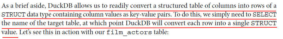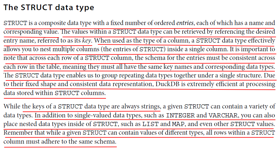 It’s worth remembering that JSON objects are generally slower to work with than a DuckDB STRUCT data type, which may look superficially similar. The consistency of the STRUCT object allows DuckDB to perform several optimizations, meaning they are almost always more efficient and faster to manipulate than JSON objects.