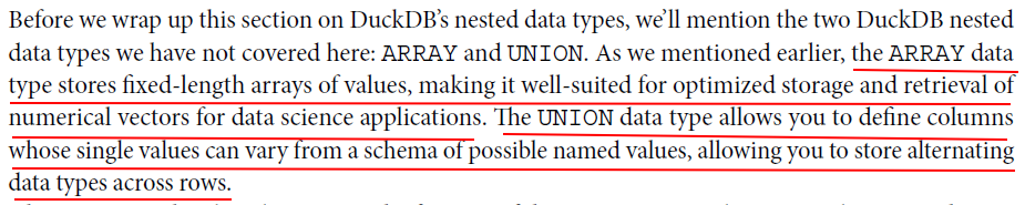 DuckDB’s nested data types: LIST, MAP, and STRUCT.