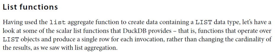 A particularly useful pattern that DuckDB supports is aggregating column-wise row groups into LIST instances that contain the contents of each group as a single value. This functionality is enabled through DuckDB’s list aggregate function.