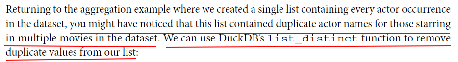 D SELECT list_distinct(list(actor_name)) AS actors FROM film_actors; ┌─────────────────────────────────────────────────────────────────────────────────────────┐ │ actors │ │ varchar[] │ ├─────────────────────────────────────────────────────────────────────────────────────────┤ │ [Ryan Gosling, Margot Robbie, Christoph Waltz, Léa Seydoux, Ana de Armas, Daniel Craig] │ └─────────────────────────────────────────────────────────────────────────────────────────┘