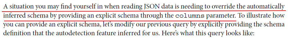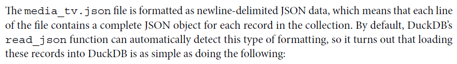 D SELECT * FROM read_json( 'media_tv.json', columns = { media_type: 'VARCHAR', name: 'VARCHAR', media_payload: 'STRUCT( type VARCHAR, genres VARCHAR[], premiered DATE, schedule STRUCT( time VARCHAR, days VARCHAR[] ) )' } ); ┌────────────┬──────────────┬───────────────────────────────────────────────────────────────────────────────────────────────────────────────────────────┐ │ media_type │ name │ media_payload │ │ varchar │ varchar │ struct("type" varchar, genres varchar[], premiered date, schedule struct("time" varchar, "days" varchar[])) │ ├────────────┼──────────────┼───────────────────────────────────────────────────────────────────────────────────────────────────────────────────────────┤ │ tv │ The Simpsons │ {'type': Animation, 'genres': [Comedy, Family], 'premiered': 1989-12-16, 'schedule': {'time': 19:00, 'days': [Sunday]}} │ │ tv │ Bluey │ {'type': Animation, 'genres': [Kids], 'premiered': 2018-10-04, 'schedule': {'time': 08:00, 'days': [Saturday, Sunday]}} │ │ tv │ Friends │ {'type': Scripted, 'genres': [Comedy, Romance], 'premiered': 1994-09-20, 'schedule': {'time': 20:00, 'days': [Thursday]}} │ └────────────┴──────────────┴───────────────────────────────────────────────────────────────────────────────────────────────────────────────────────────┘