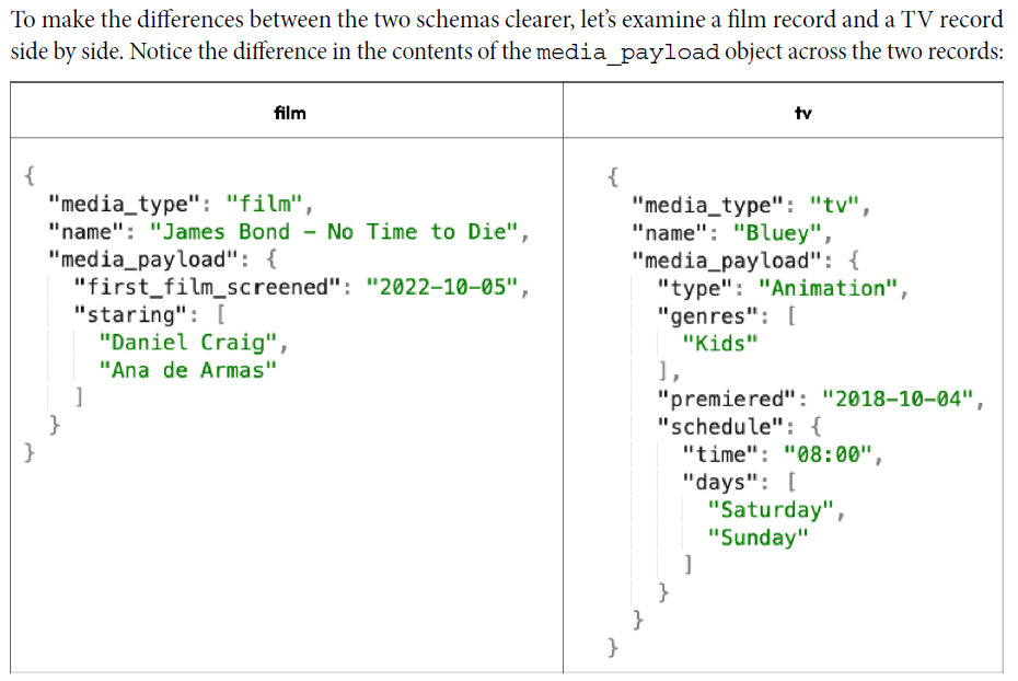 This query gives us a clear indication of the schemas across both types of records, including where they diverge, through the appearance of NULL values: