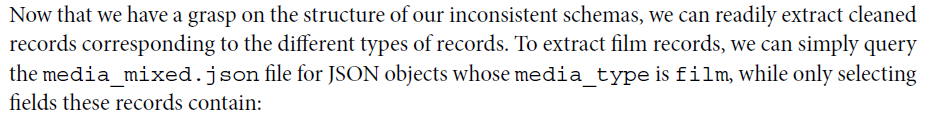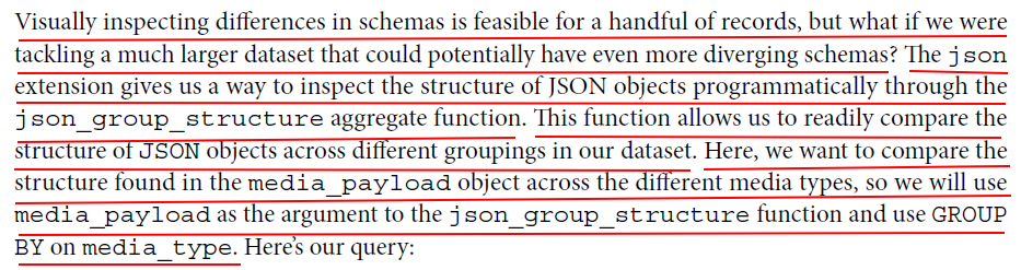 D SELECT media_type, json_group_structure(media_payload) FROM read_json('media_mixed.json') GROUP BY media_type; ┌────────────┬────────────────────────────────────────────────────────────────────────────────────────────────────────────────────────────────────────────┐ │ media_type │ json_group_structure(media_payload) │ │ varchar │ json │ ├────────────┼────────────────────────────────────────────────────────────────────────────────────────────────────────────────────────────────────────────┤ │ film │ {"first_film_screened":"VARCHAR","staring":["VARCHAR"],"type":"NULL","genres":"NULL","premiered":"NULL","schedule":"NULL"} │ │ tv │ {"first_film_screened":"NULL","staring":"NULL","type":"VARCHAR","genres":["VARCHAR"],"premiered":"VARCHAR","schedule":{"time":"VARCHAR",… │ └────────────┴────────────────────────────────────────────────────────────────────────────────────────────────────────────────────────────────────────────┘