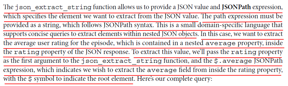 D SELECT season, number, name, json_extract_string(rating, '$.average') AS avg_rating, summary FROM read_json('https://api.tvmaze.com/shows/83/episodebynumber?season=34&number=2'); ┌────────┬────────┬────────────────┬────────────┬────────────────────────────────────────────────────────────────────────────────────────────┐ │ season │ number │ name │ avg_rating │ summary │ │ int64 │ int64 │ varchar │ varchar │ varchar │ ├────────┼────────┼────────────────┼────────────┼────────────────────────────────────────────────────────────────────────────────────────────┤ │ 34 │ 2 │ One Angry Lisa │ 6.8 │ <p>Lisa gets called for jury duty while Marge becomes obsessed with her exercise bike.</p> │ └────────┴────────┴────────────────┴────────────┴────────────────────────────────────────────────────────────────────────────────────────────┘
