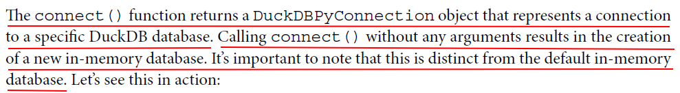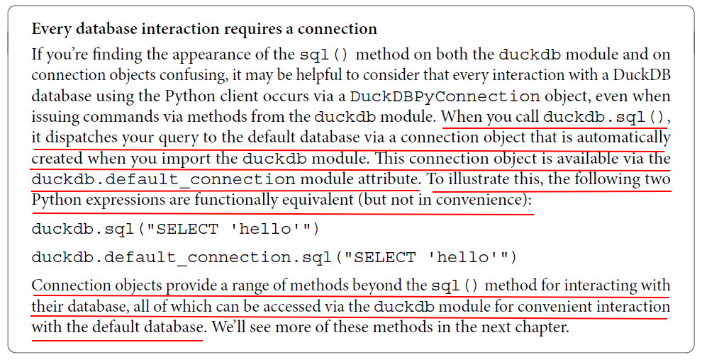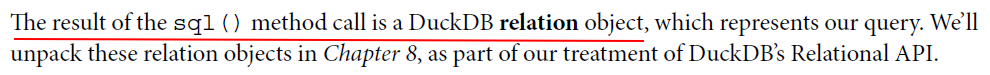 conn = duckdb.connect() conn.sql( """ CREATE TABLE hello AS SELECT 'pato' AS animal, 'cuac!' AS greeting """ ) conn.sql("SELECT * FROM hello")