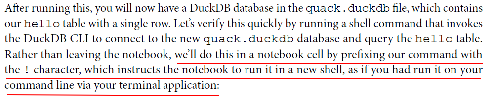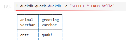 conn = duckdb.connect(database="quack.duckdb") conn.sql( """ CREATE OR REPLACE TABLE hello AS SELECT 'ente' AS animal, 'quak!' AS greeting """ ) conn.close()