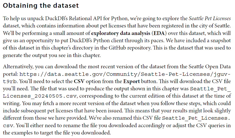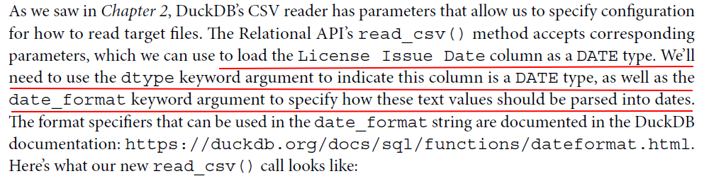 pets_csv_relation = duckdb.read_csv( "data/C08/Seattle_Pet_Licenses.csv", dtype={"License Issue Date": "DATE"}, date_format="%B %d %Y", ) pets_csv_relation.types # [DATE, VARCHAR, VARCHAR, VARCHAR, VARCHAR, VARCHAR, VARCHAR]