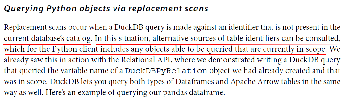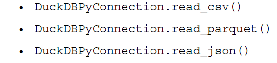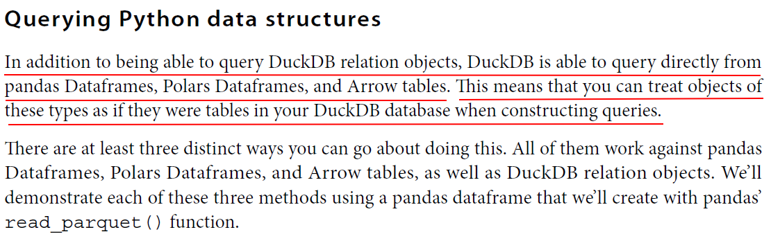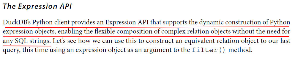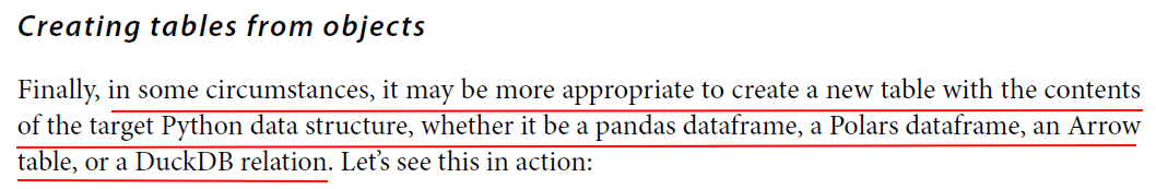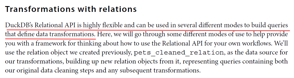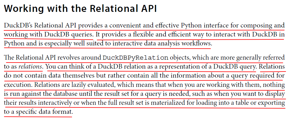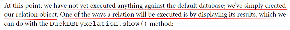pi_relation = duckdb.sql("SELECT pi() AS pi") type(pi_relation) # duckdb.duckdb.DuckDBPyRelation