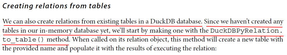 Now, we can make a relation from this table we’ve just created using the DuckDBPyConnection.table() method: