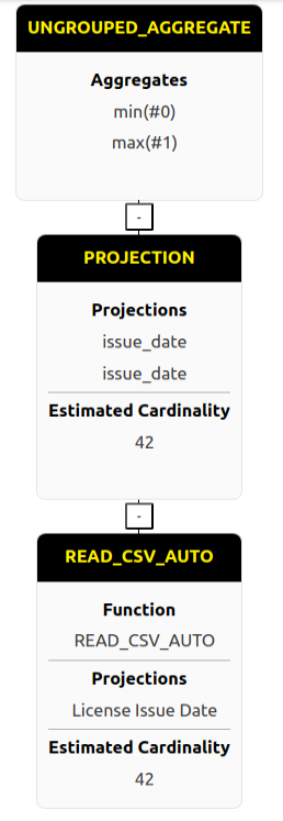 min_max_relation = duckdb.sql( """ SELECT min(issue_date), max(issue_date) FROM pets_cleaned_relation """ ) min_max_relation
