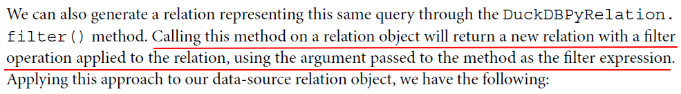 from duckdb import ColumnExpression, ConstantExpression species_col = ColumnExpression("species") pig_constant = ConstantExpression("Pig") pets_cleaned_relation.filter(species_col == pig_constant)
