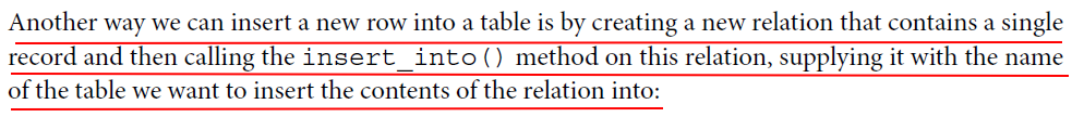 new_dog2 = ( "2024-05-19", "Pixie", "Dog", "Australian Kelpie", ) new_dog_rel = conn.values(new_dog2) new_dog_rel.insert_into("pets")