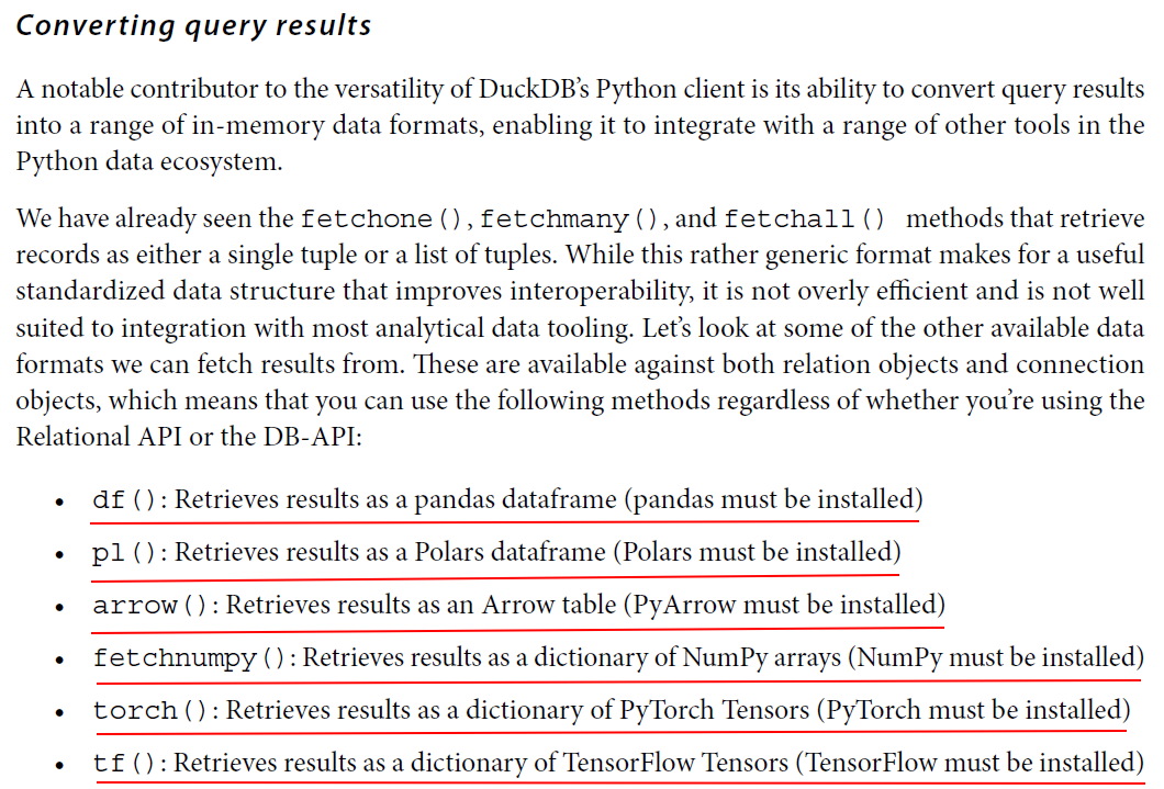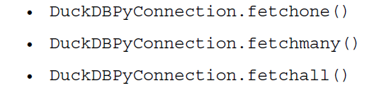 Note that this is not an exhaustive list; see the DuckDB documentation for reference (https://duckdb.org/docs/api/python/result_conversion).