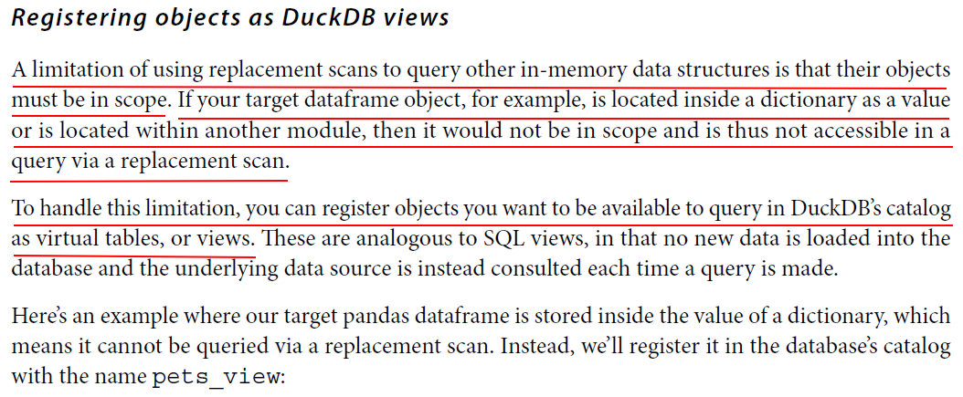 pets_df = pd.read_parquet("seattle_pets.parquet") duckdb.sql( """ CREATE OR REPLACE TABLE pets_table_from_df AS SELECT * FROM pets_df """ ) duckdb.sql("SELECT * FROM pets_table_from_df USING SAMPLE 1")