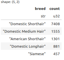 import polars as pl polars_df = seattle_pets.pl() polars_df.filter( pl.col("species") == "Cat" )["breed"].value_counts(sort=True)[:5]