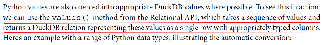 import datetime duckdb.values( [ 10, 1_000_000, 0.95, "hello string", b"hello bytes", True, datetime.date.today(), None, ] )