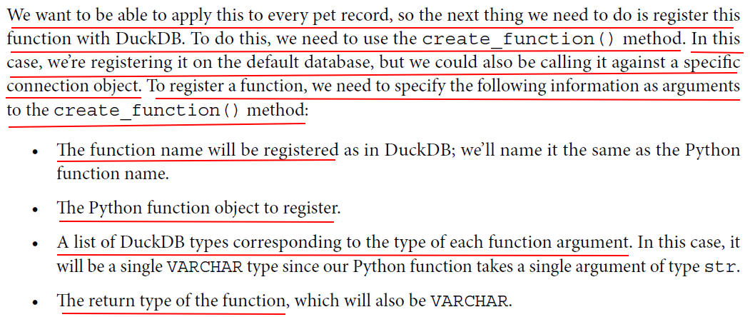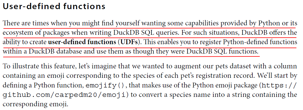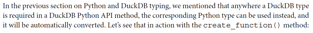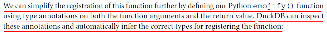 duckdb.create_function( "emojify", emojify, [duckdb.typing.VARCHAR], duckdb.typing.VARCHAR )